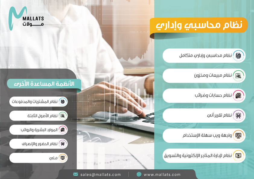 نظم مولات الحسابية والإدارية يوفر نظام شامل لإدارة المخزون والمبيعات والبيانات المالية مع ضريبة القيمة المضافة. إنه قابل للتطوير ويتكون من مجموعة أنظمة فرعية يمكن إضافتها في أي وقت مثل المشتريات أو كشوف الرواتب.- نظم محاسبية وإدارية شاملة