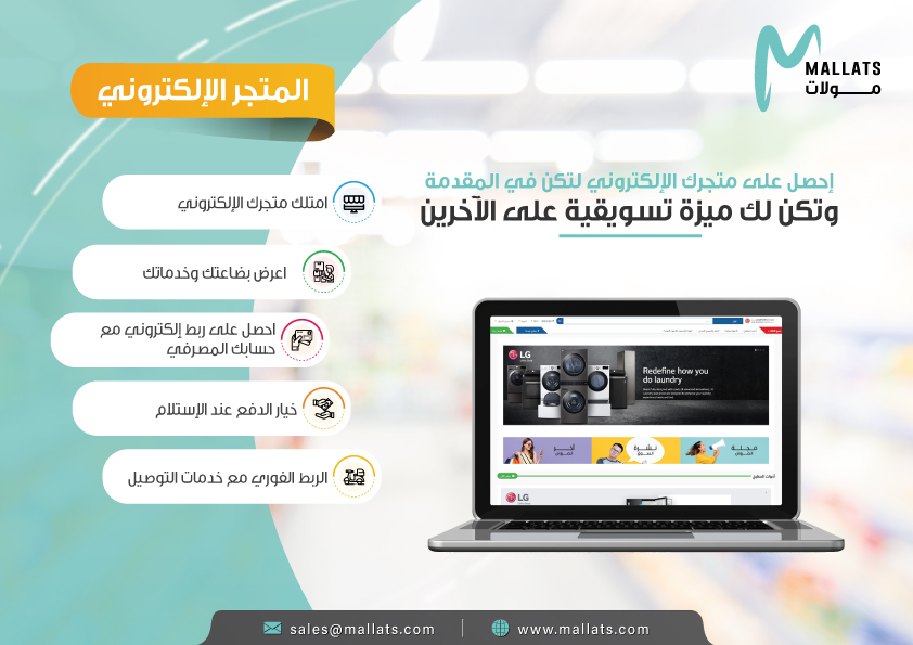 سيوفر متجر مولات الإلكتروني موقعًا تجارياً إلكترونيًا للتاجر حيث يقدم فيه قائمة بالمنتجات التي يتم إدراتها بواسطة النظم المحاسبية والإدارية. إنه منصة واحدة تتيح للشركات البيع على عملائها أينما كانوا سواء على الإنترنت أو شخصيًا وفي كل مكان.مميزات متجر مولات الإلكتروني: