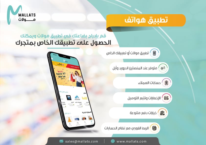 تطبيق مولات للهواتف المحمولة عبارة عن مجموعة من المتاجر الإلكترونية المتميزة الموجودة في تطبيق واحد للهواتف المحمولة والأجهزة اللوحية من Apple و Android وهي مصممة لعرض منتجات وخدمات التجار والتي تمكّن العملاء من التسوق تحت منصة واحدة.مميزات تطبيق مولات للهواتف المحمولة: