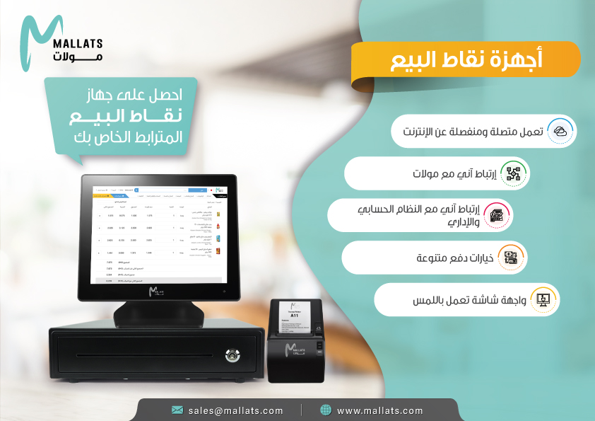 توفر مولات أجهزة نقاط بيع (POS) مرتبطة بنظام إدارة المبيعات في مولات (متصل و غير متصل).مميزات أجهزة نقاط البيع التابعة لمولات :